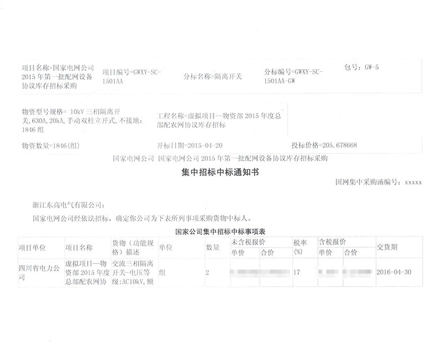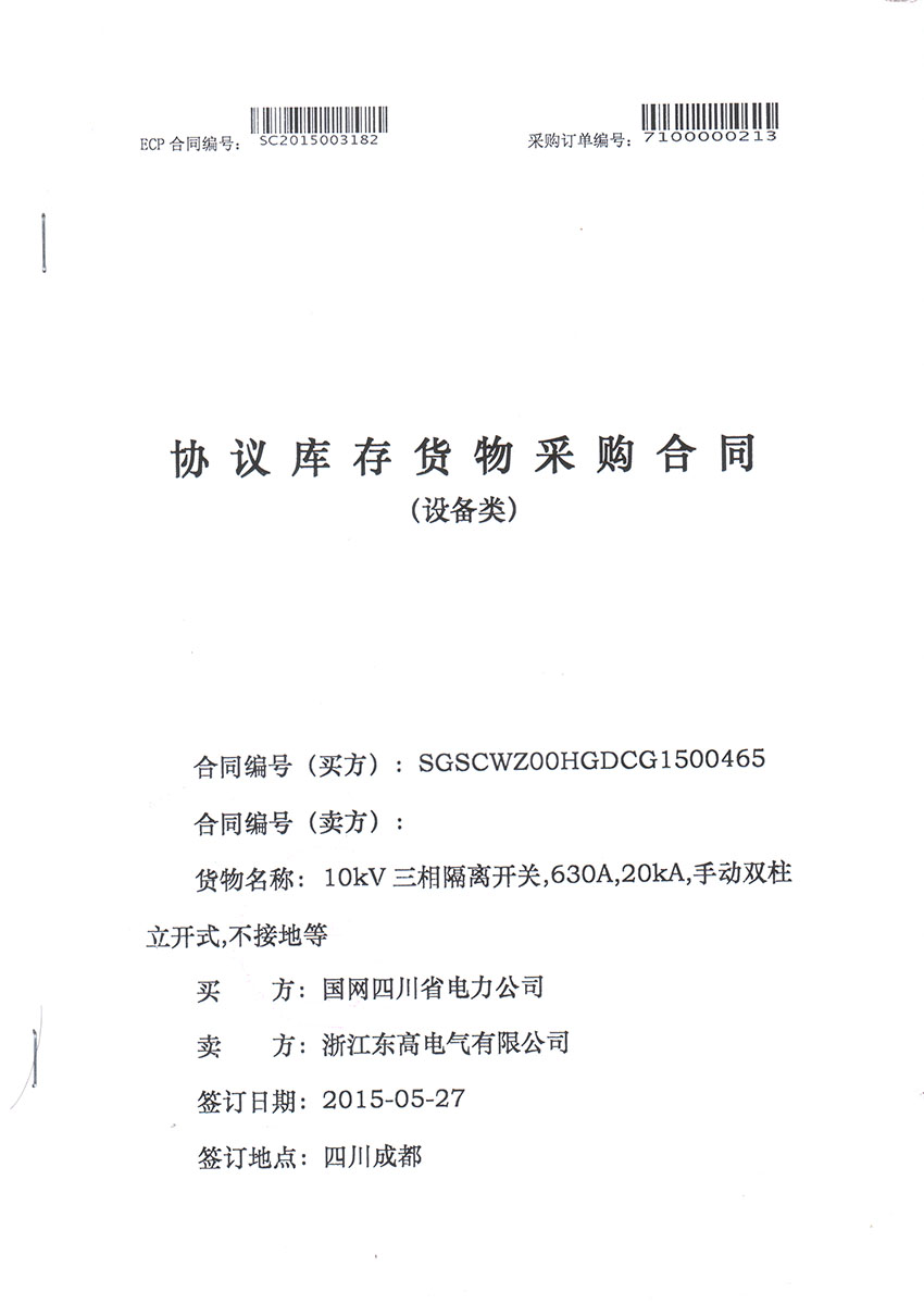 2015年浙江东高电气有限公司与国网四川省电力公司采购合同。